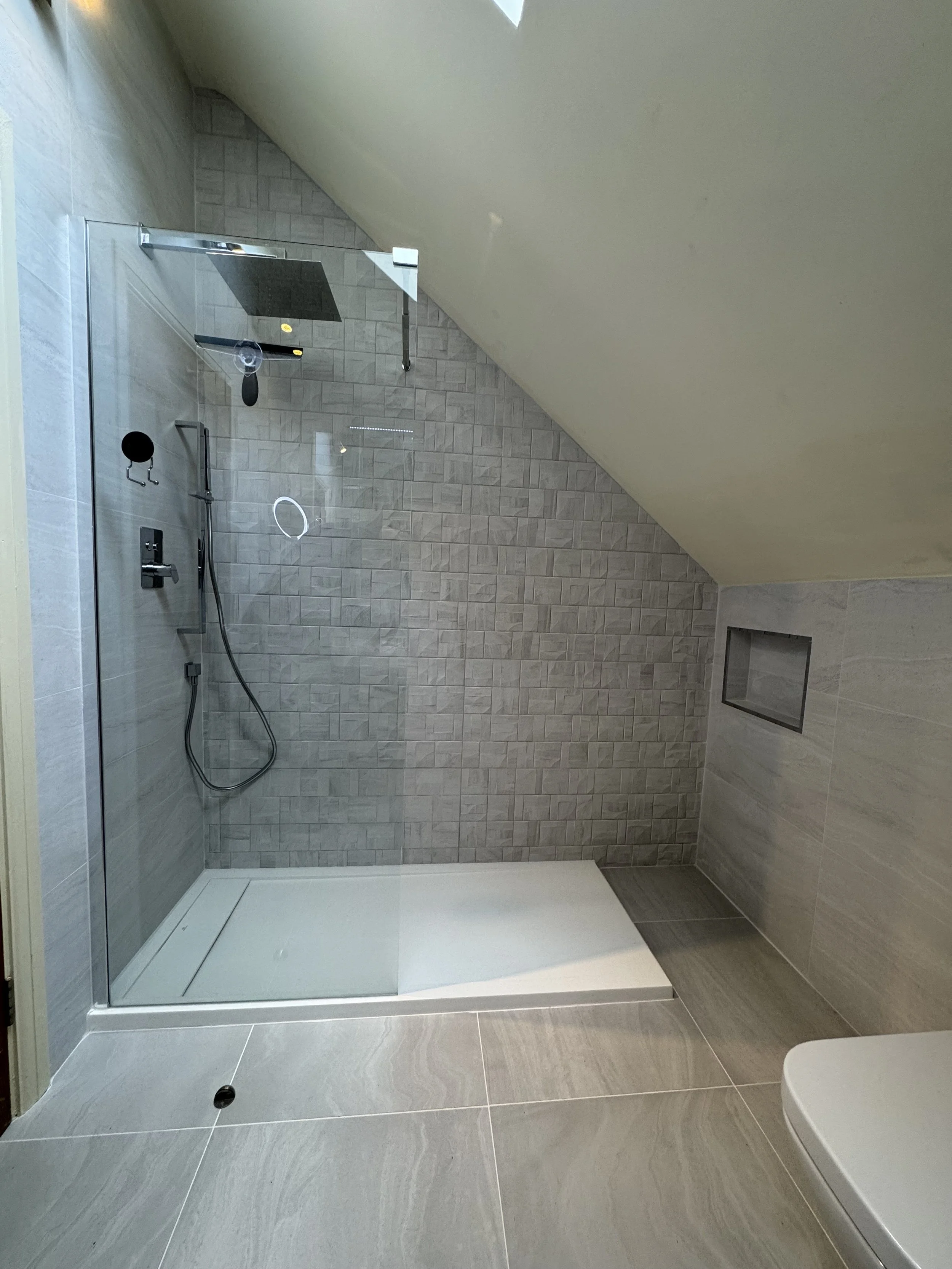 Modern shower with grey tile walls, a handheld showerhead on a flexible hose, and a control panel.