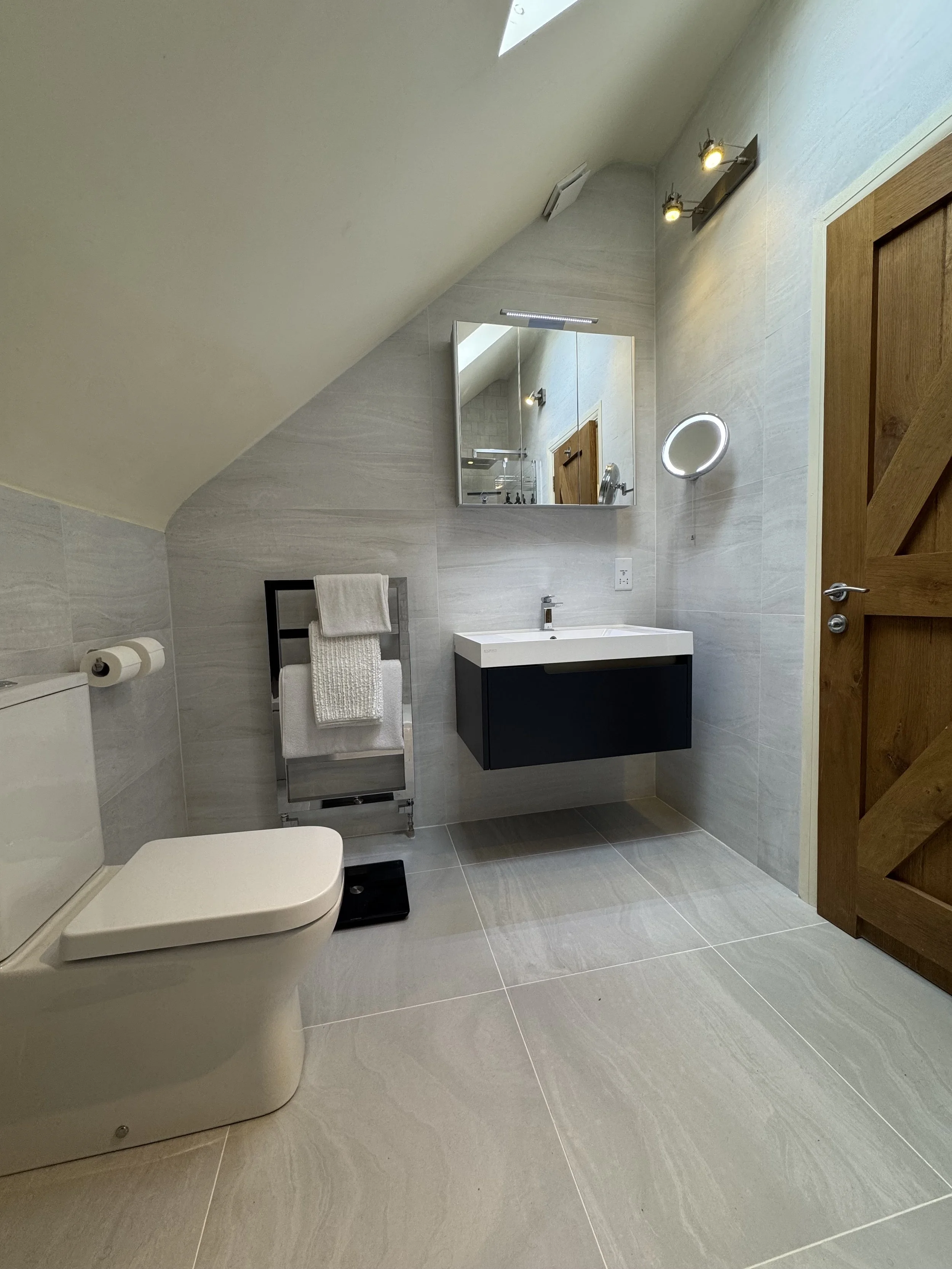 Modern bathroom with wall-mounted sink, illuminated mirror, toilet, gray cabinets, and tile flooring.