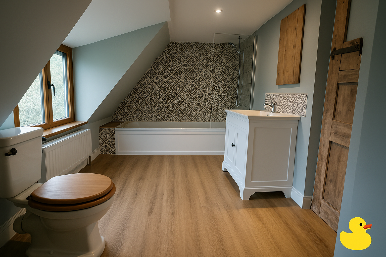 Modern bathroom with a toilet, wood-look flooring, bathtub with patterned tiles, white vanity, and wooden elements.